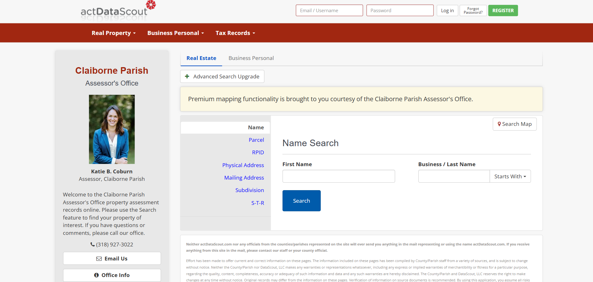 Thank you for visiting our new Claiborne Parish Assessor’s Office website. This website was created to give the taxpayers of Claiborne Parish access to property information including owners, legal descriptions and maps of the area. It also explains the functions and responsibilities of the assessor’s office and answers some of the most commonly asked questions about assessment of property.